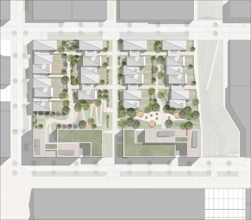 Le projet respecte la logique d’implantation du plan d’urbanisme. Il se décompose en 6 corps de bâtiment. Afin de renforcer le caractère urbain de l’espace public, chacun des corps de bâtiment présente à minima, une façade implantée en alignement sur la rue. Cet alignement est discontinu, aussi bien pour maintenir les porosités visuelles nécessaires entre l’espace public et l’îlot que pour produire une volumétrie bâtie riche.