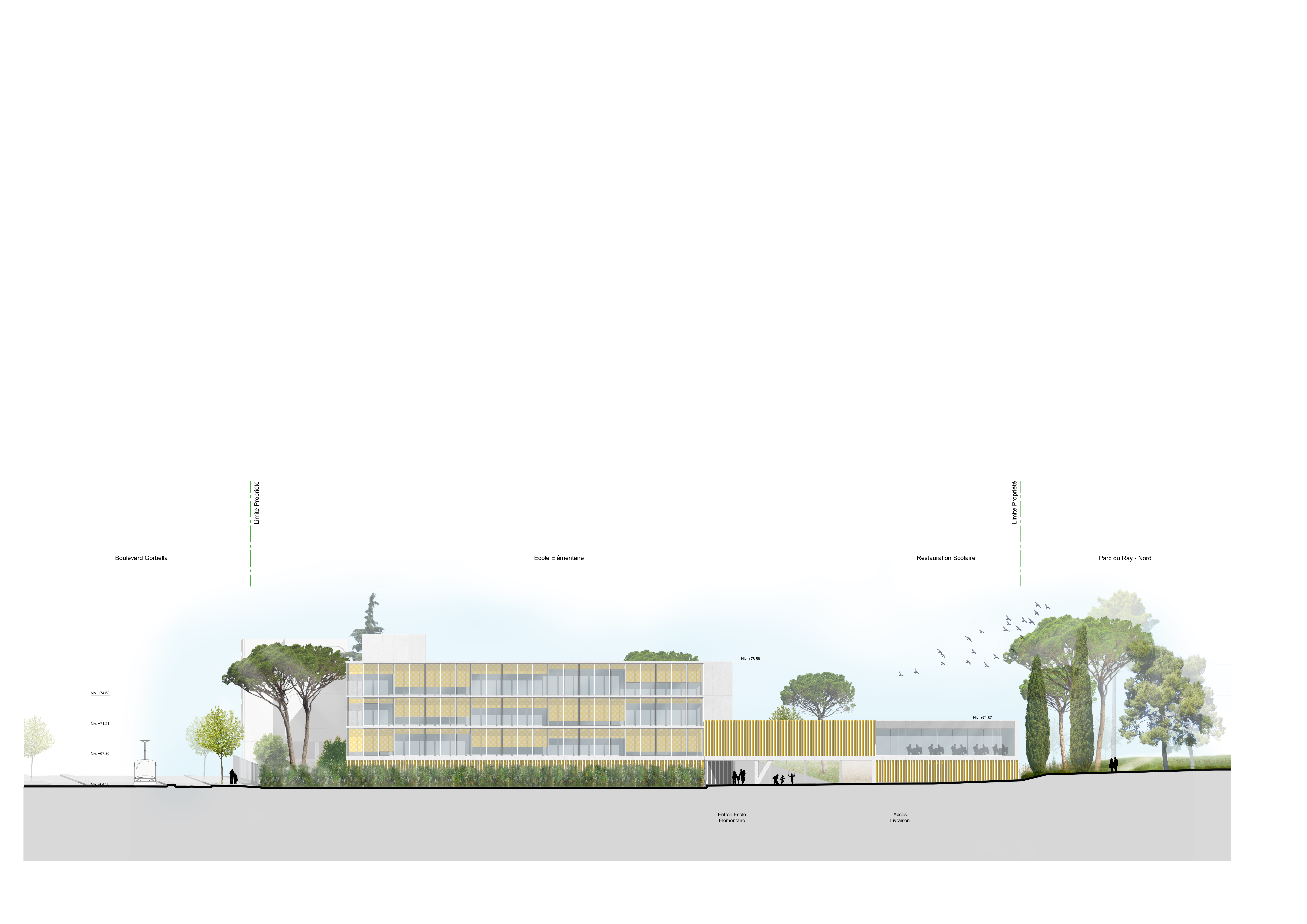 La morphologie du bâtiment se développe sur un seul niveau. C’est une ligne horizontale qui s’incruste dans la topographie et révèle la pente du parc à l’Est et s’efface derrière une épaisseur de végétation à l’Ouest, le long du boulevard Gorbella. Au sud, le long du mail Est-Ouest, cette même topographie révèle un bâtiment en R+1 qui se raccorde avec celui de l’élémentaire existant. Cette présence un peu plus forte au Sud dialogue avec les bâtiments de logements en vis à vis du groupe scolaire.